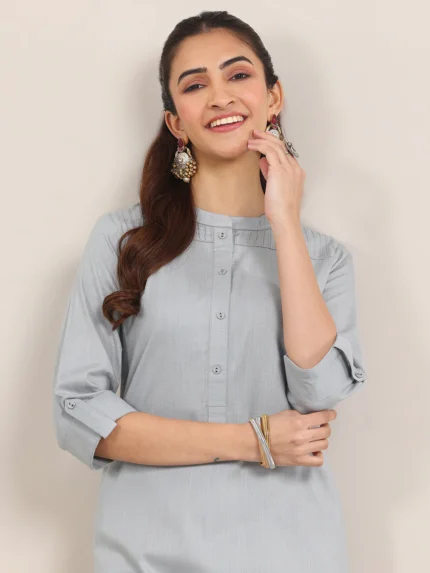 Dark Teal Ethnic Motif Printed Rayon Straight Kurta & Dupatta Set with Buttons.